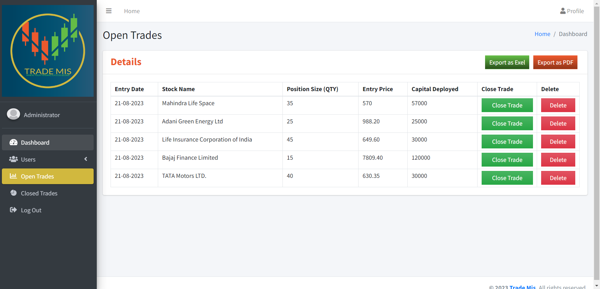Stay on top of your trading performance by effortlessly listing your open and closed trades. Monitor your profit and loss in real-time, identify patterns, and gain valuable insights into your trading strategy's effectiveness. With Trade MIS, you'll have a clear overview of your success and areas for improvement.
